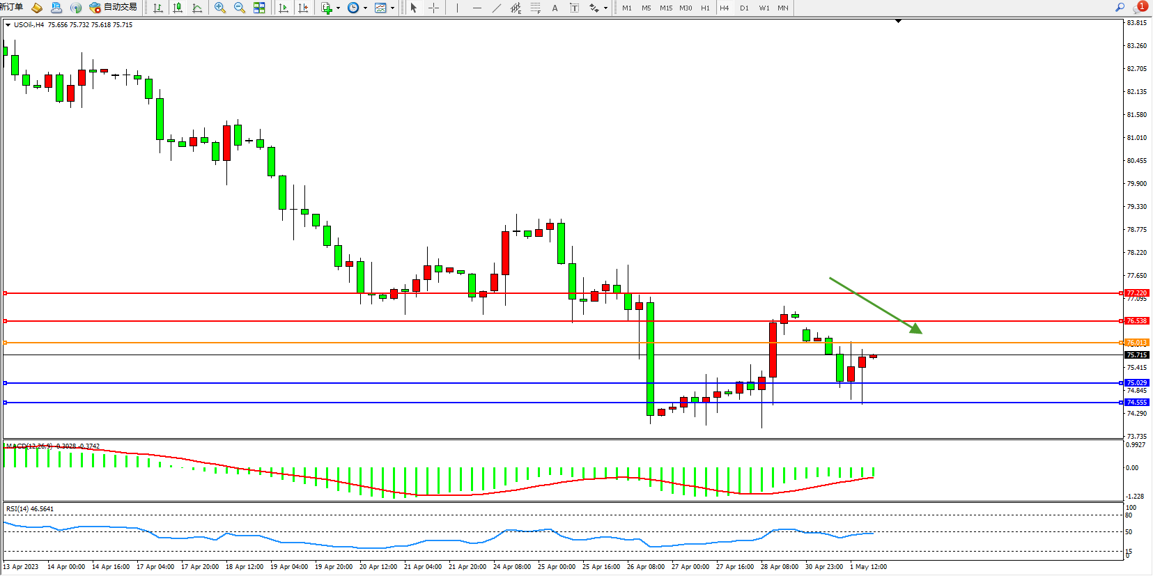 交易策略:76.013下方看跌,目标75.029 74.555