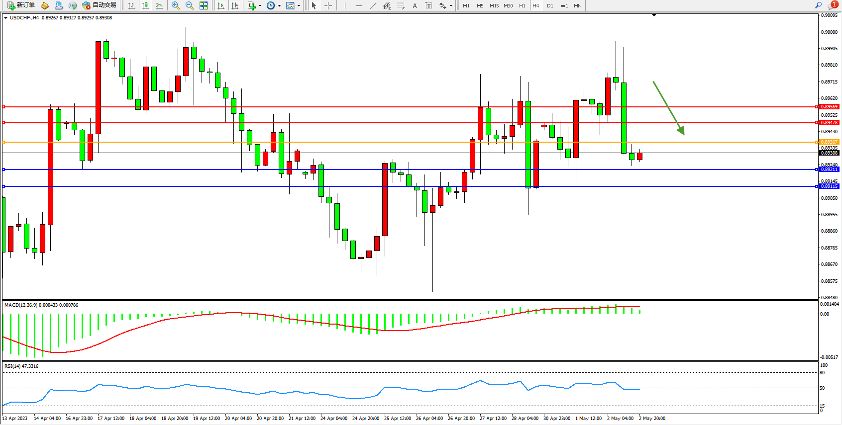 美元瑞郎USDCHF——4小时K线图显示: