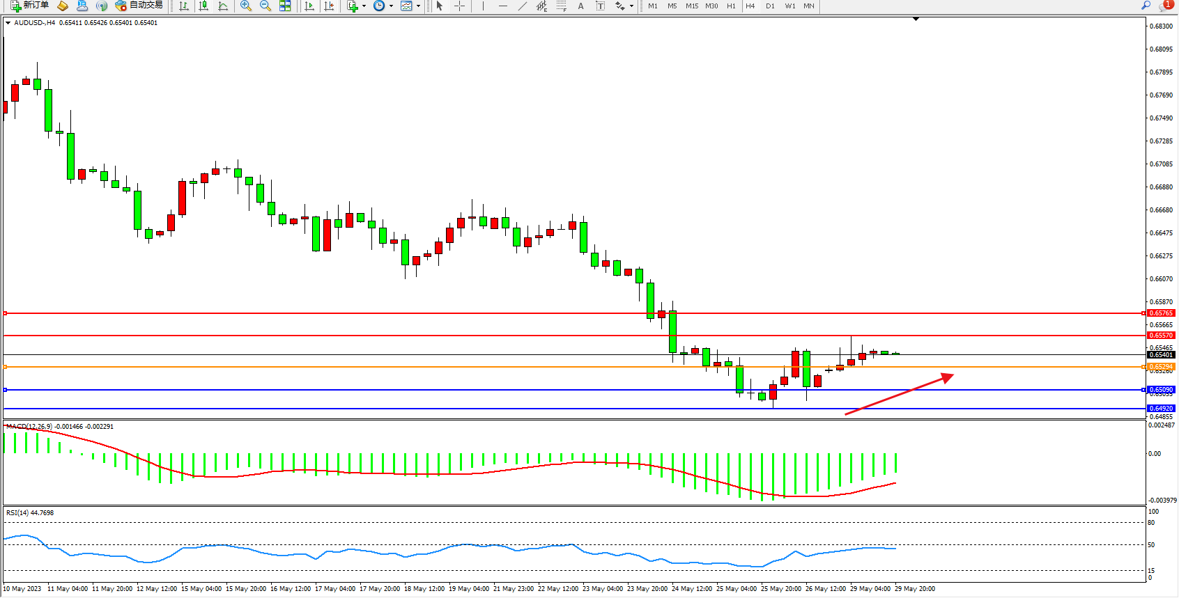 交易策略:0.65294上方看涨,目标0.65570  0.65765