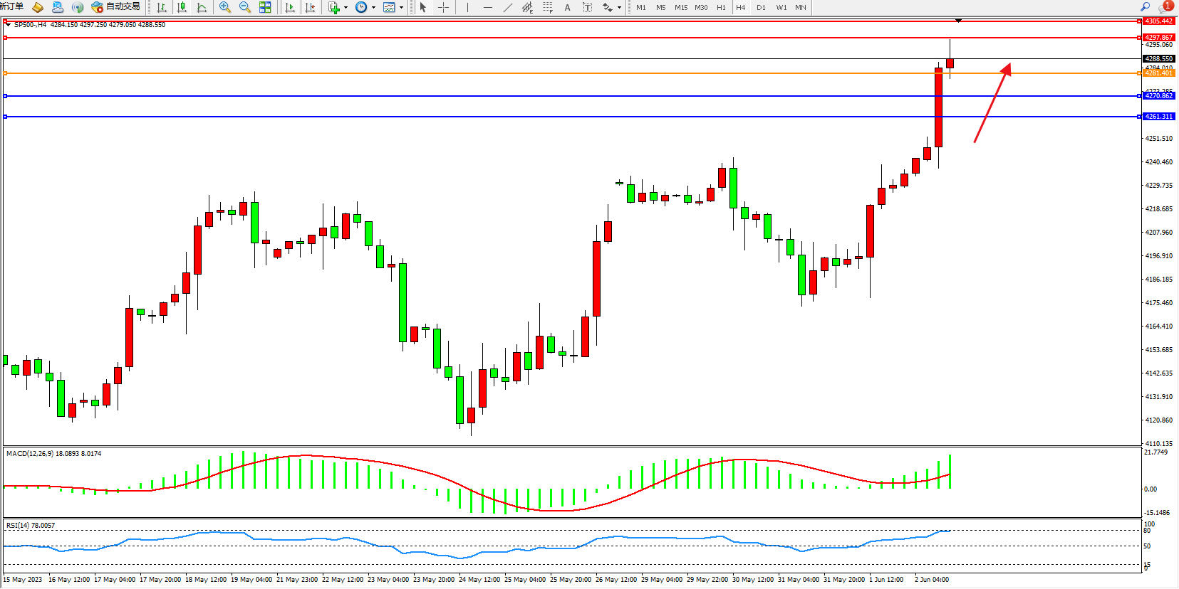 标普SP500——4小时K线图显示: