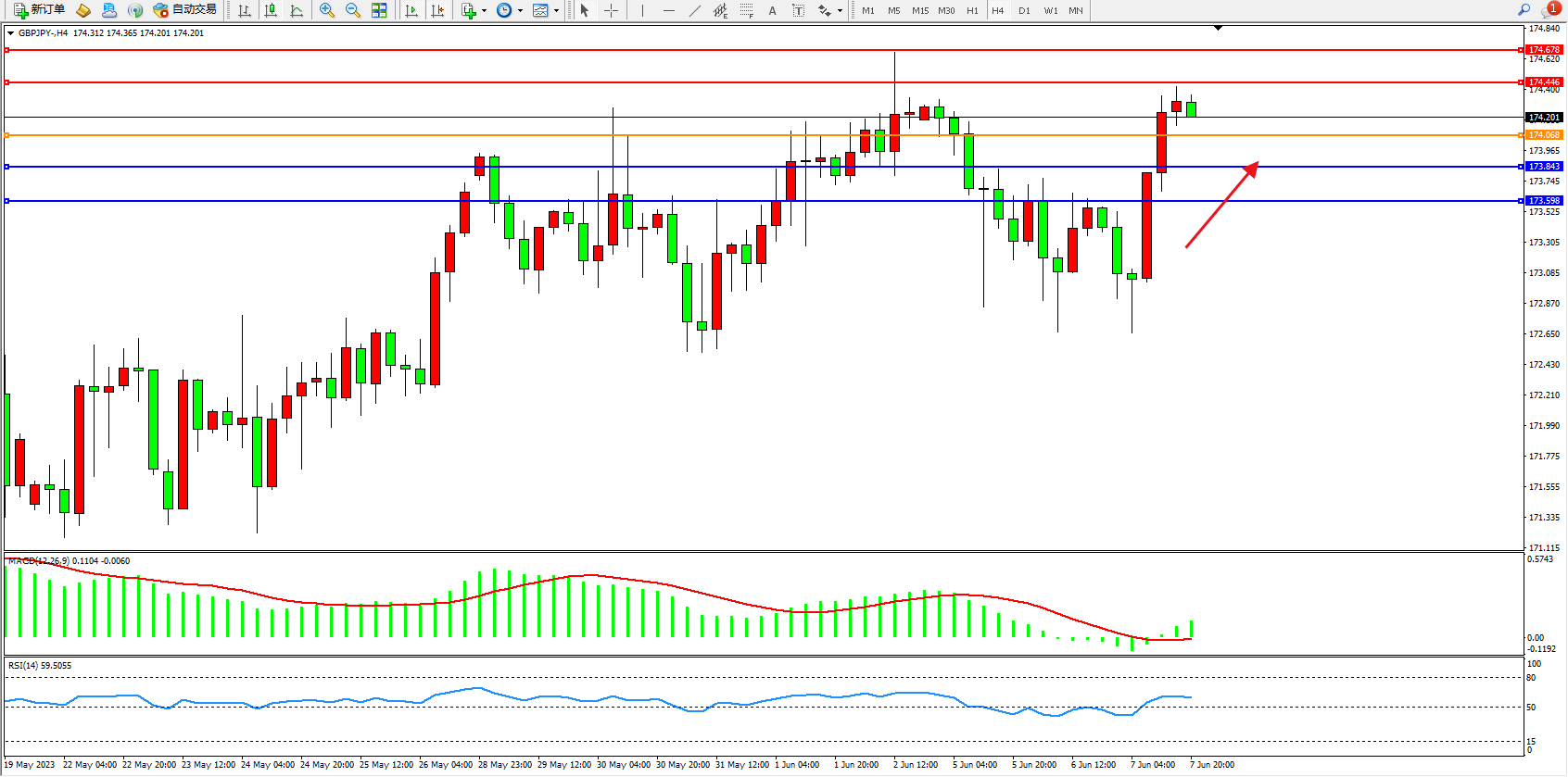 阻力位:174.446  174.678