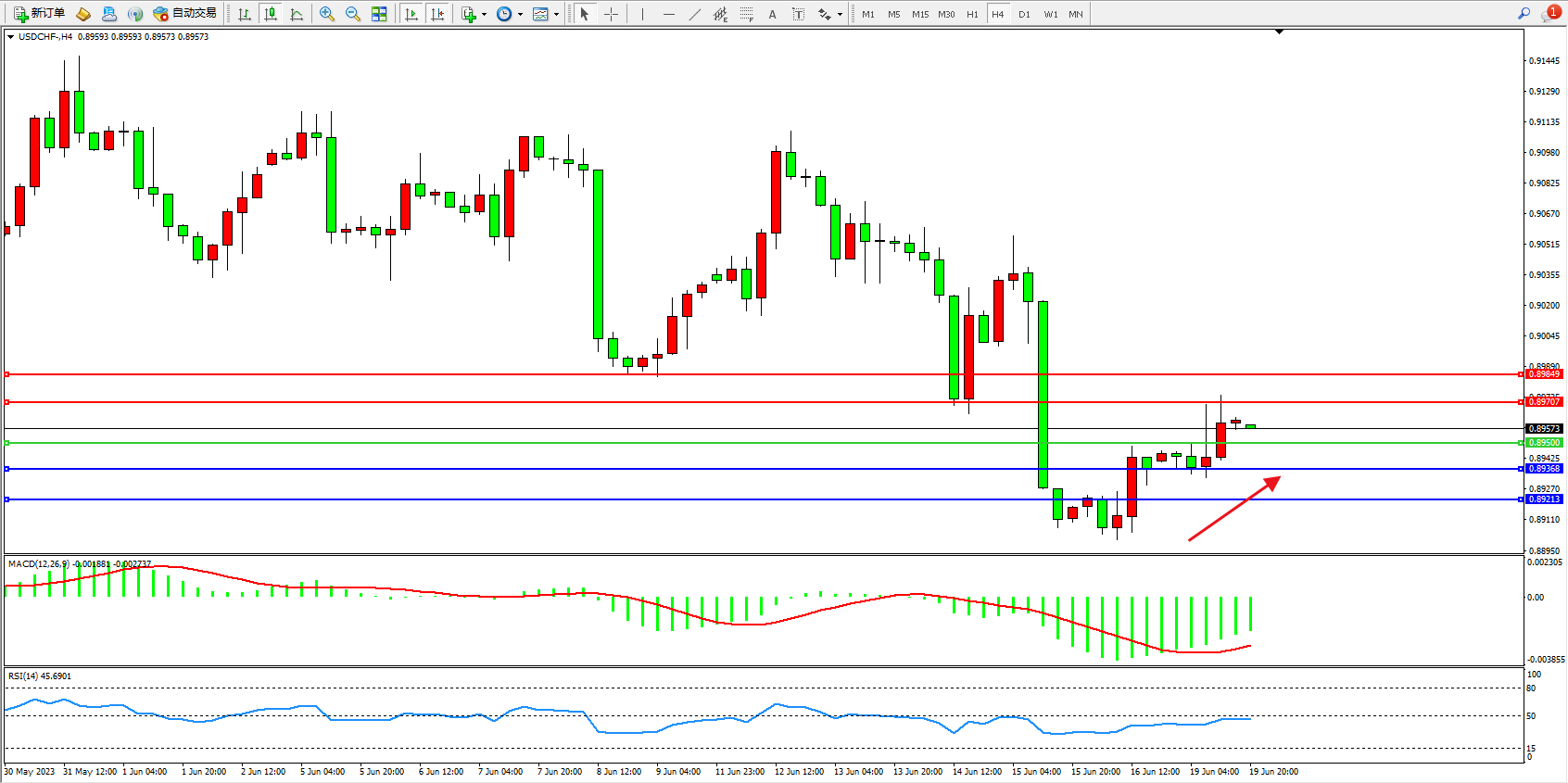 美元瑞郎USDCHF——4小时K线图显示: