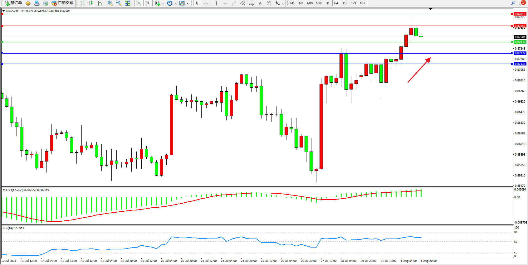 美元瑞郎USDCHF——4小时K线图显示: