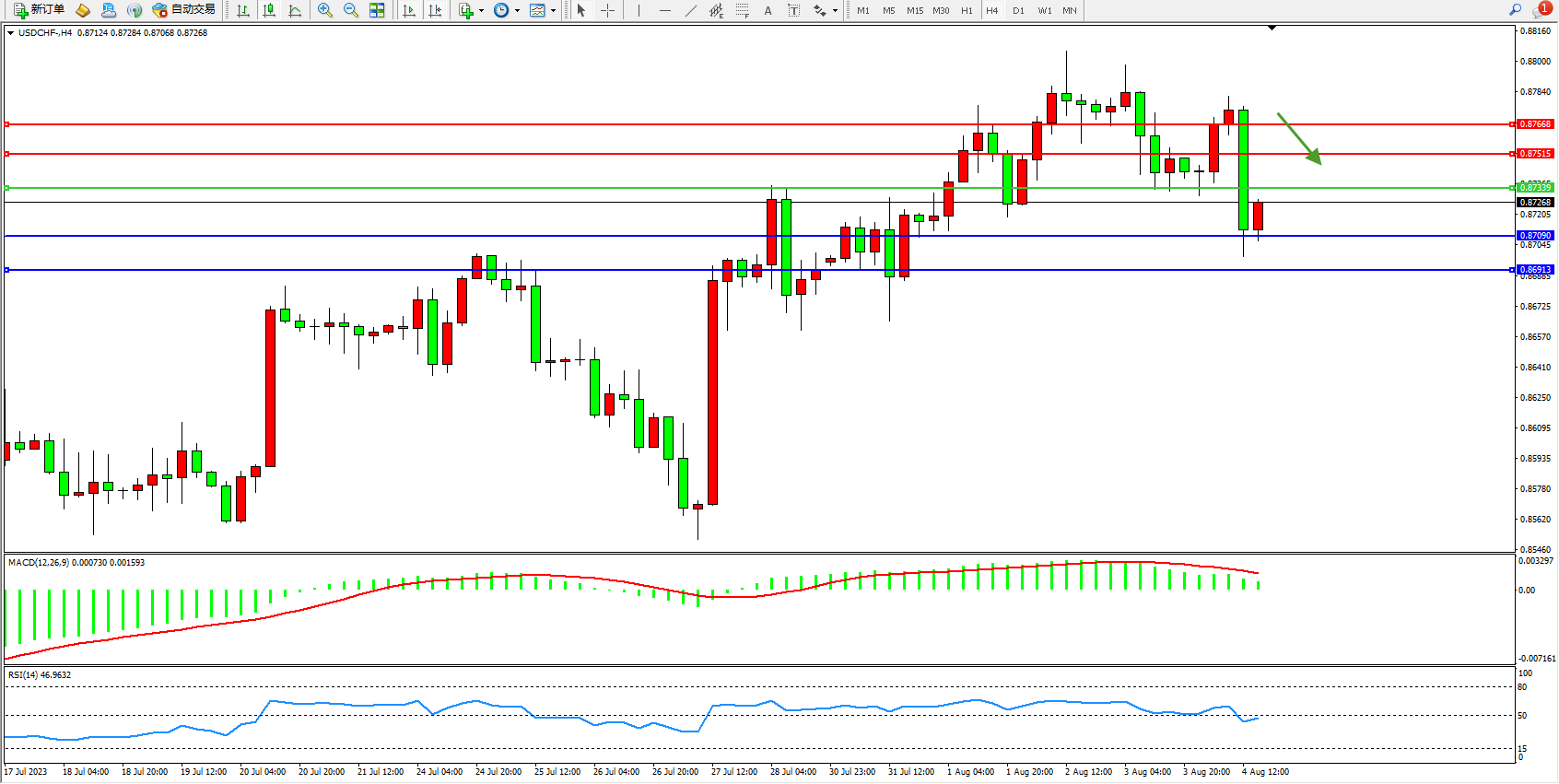 美元瑞郎USDCHF——4小时K线图显示: