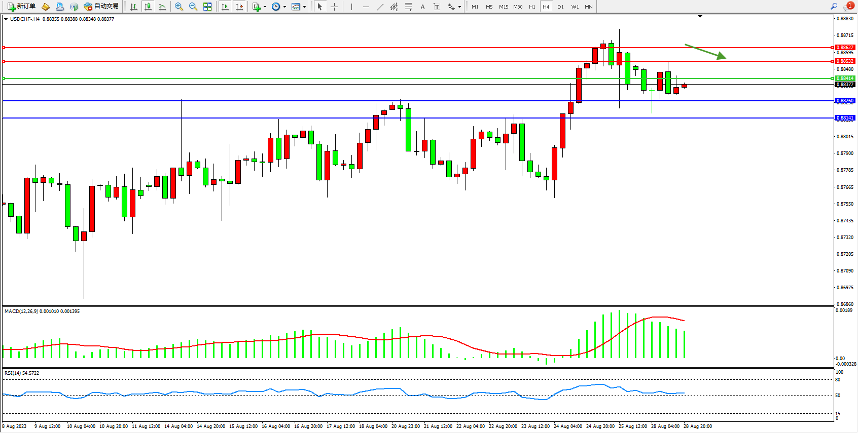 美元瑞郎USDCHF——4小时K线图显示: