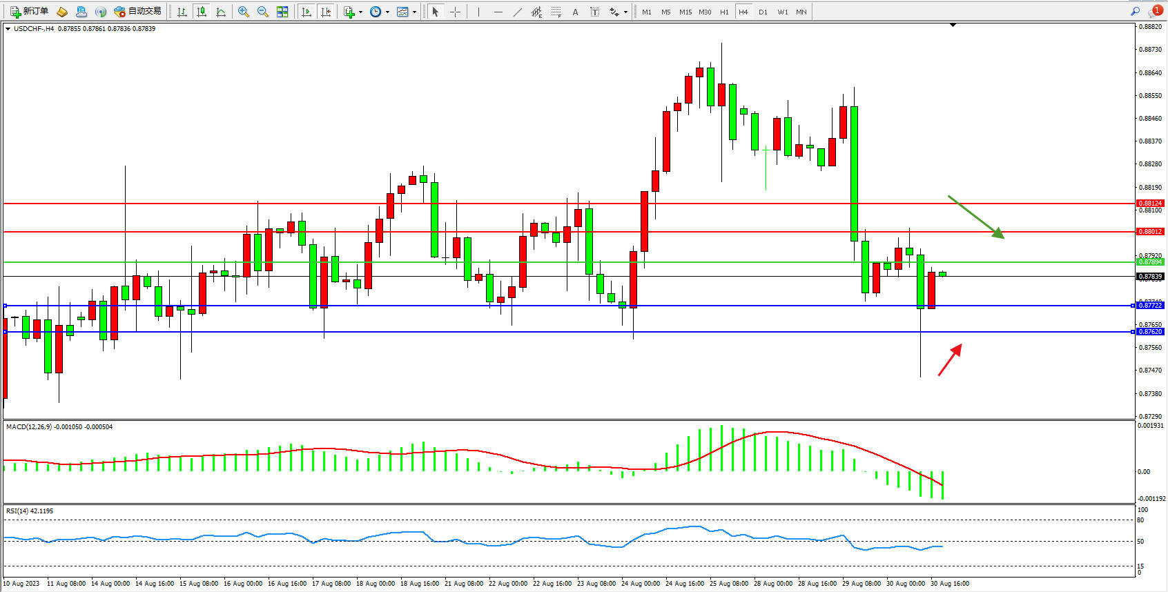 美元瑞郎USDCHF——4小时K线图显示: