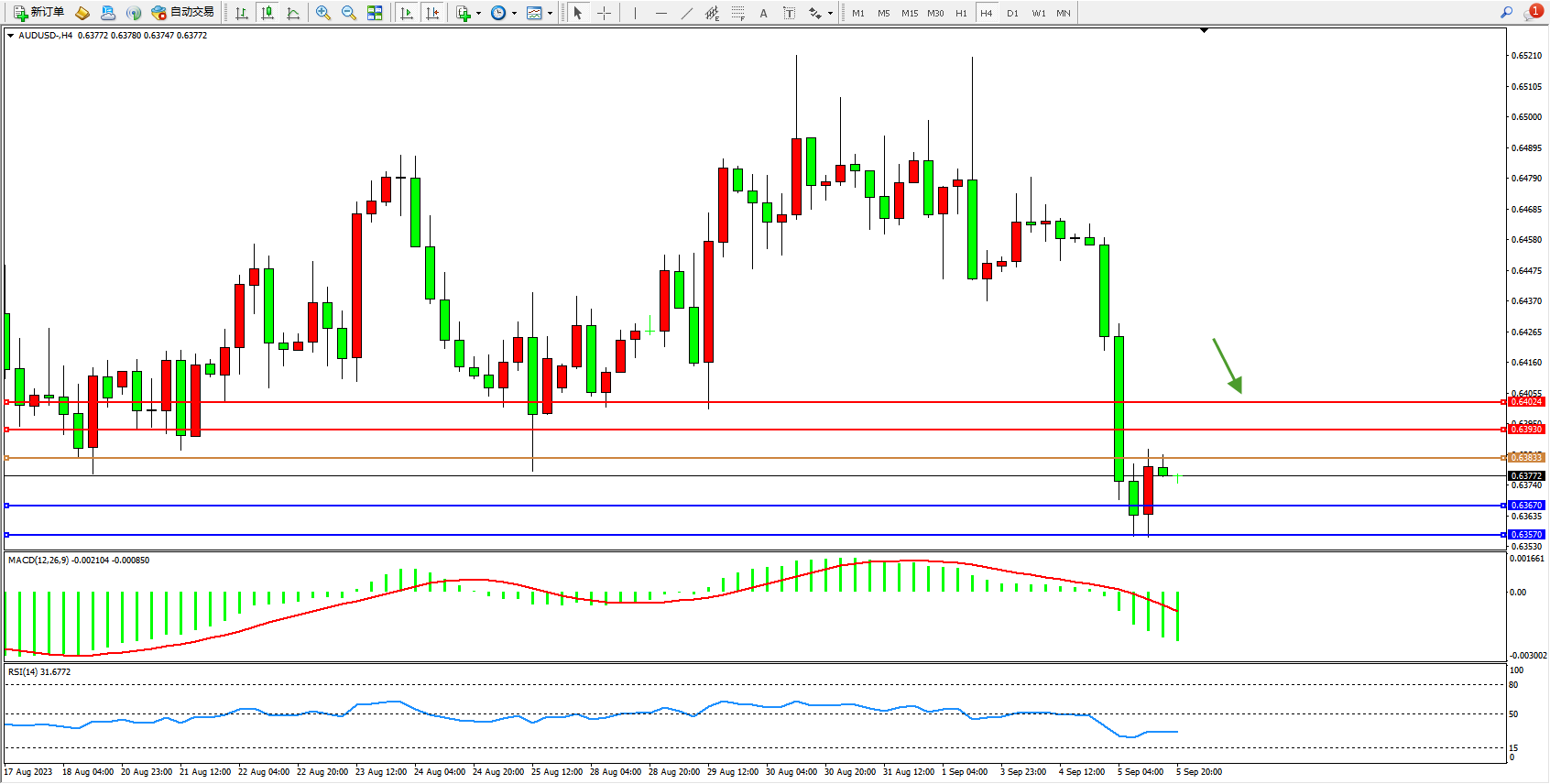 澳元美元AUDUSD——4小时K线图显示: