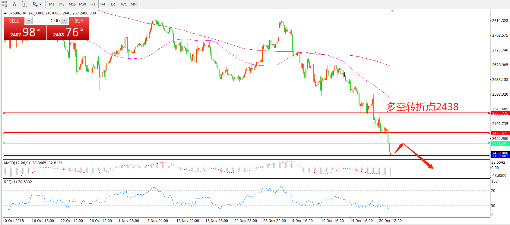 4小时图看,SP500呈现破位下行状态,连续击穿两道支撑后于2400附近企稳,均线系统呈空头排列之, MACD绿柱增加,RSI处于超跌区域,短期有反弹可能,但整体下行走势明显。。