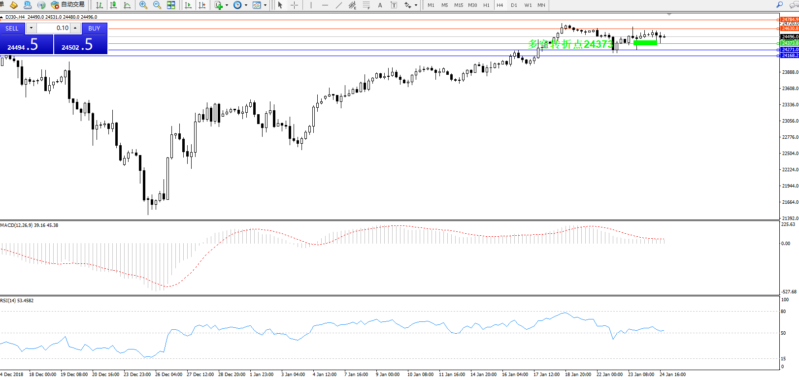 道琼斯指数DJ30—— 4小时K线图显示: