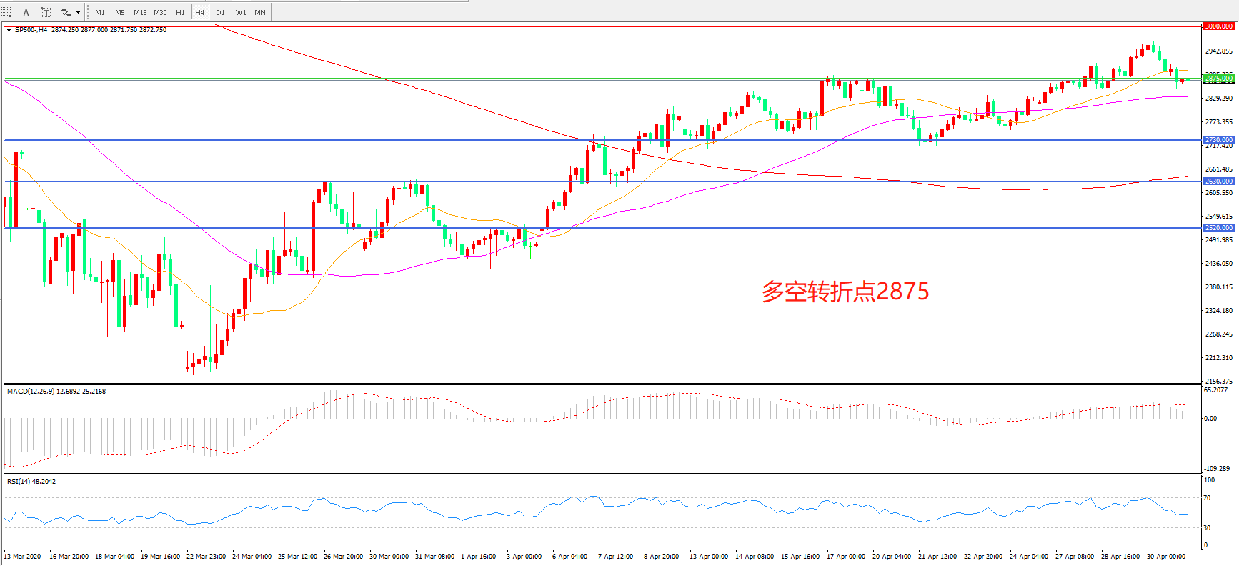 4小时图看,标普500冲高回落, 上行趋势遇阻,但上行通道未收到破坏,均线系统走平,MACD红柱减少,RSI指标走平,日内震荡上行概率较大。