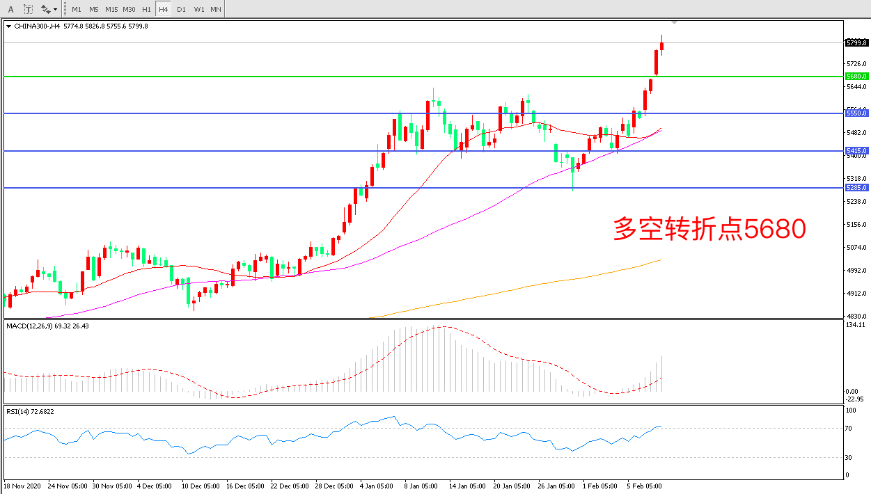 4小时图看,沪深300阳线连续拉升, 5680阻力被突破,短期表现十分强势,行情进入上行加速期,MACD红柱增加,RSI指标向上,节后延续上行概率较大。