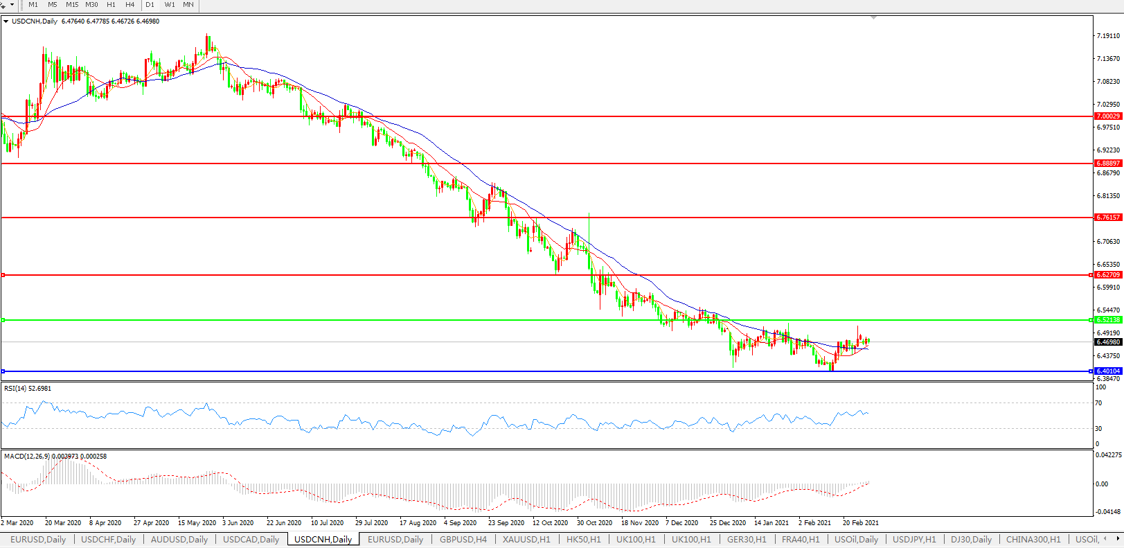 备选策略: 在6.5200之上,看涨,目标价位为6.6300,然后为6.7615