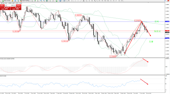 多头动力延续布林带指标通道中上轨区间持续震荡上扬,高位抵达1.37479位置附近遇阻回撤,跌破布林带指标中轨附近节点后有继续下行态势,布林带指标呈持续震荡上扬后开始收口反转向下移动,上方压制关注1.37308附近节点,低位支撑关注1.34580附近,关注1.35807附近转折点,MACD指标处于多头区域维持震荡持续回撤,RSI指标处于多头区域维持震荡下行,即将触及50均衡线附近整理,如图: