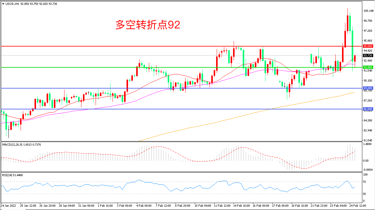 周四(2月24日),受俄乌开战事件影响,油价一度飙涨近3%,但由于美国总统拜登已强调美国不会派兵到乌克兰作战,战争结束可能较快,美国WTI原油冲高回落,收报92.97美元/桶。俄乌战争为市场增加了新的波动性和不确定性,虽然在基本面上还有很多的看涨情绪,但伊核协议也可能利空油价,多重因素影响下,油价可能延续震荡上行形态。