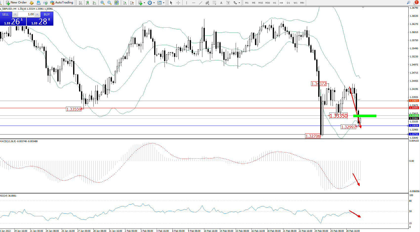 交易策略:1.33350下方看跌,目标1.33028、1.32753
