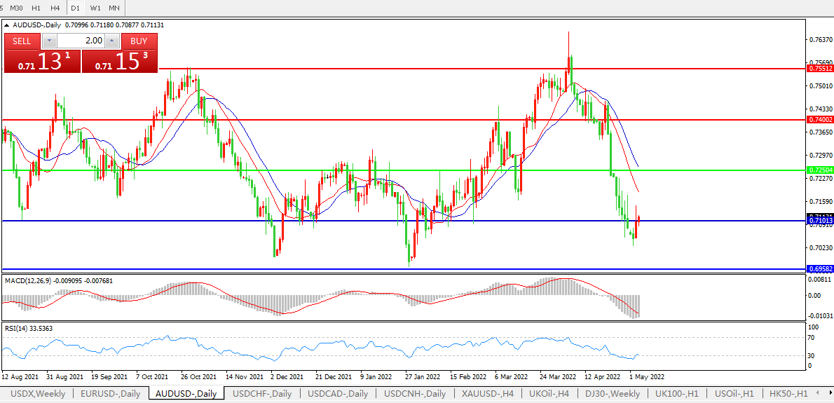 技术面简析:日图均线呈空头排列,汇价止跌后小幅反弹,MACD运行于0轴下且量能持续放量,RSI持续低迷,预计汇价大概率将进一步下行。