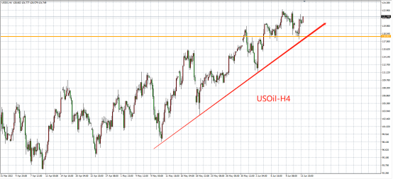WTI原油处于多周期的上涨趋势中,从4小时图看,油价在上升趋势线(118美元)未被下破前,有望继续延续张氏,上方暂看123-125美元,一旦向下破位趋势线则不排除短期顶部形成,后市或进入震荡或开启新一轮的回调,下一个支撑区域再115-112美元附近。