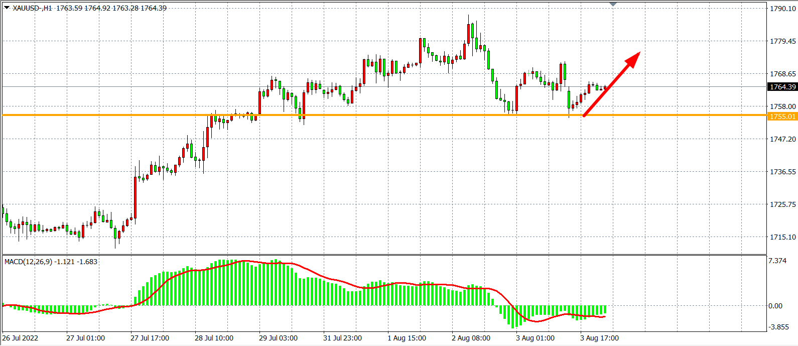 1小时图看,金价冲高回落再度整固,下方1755支撑再度得到确认,短期走势将在该位之上盘整为主,MACD于零轴之下缩量,预示行情或进一步反弹,日内在1755之上看涨,上方目标1770-1790