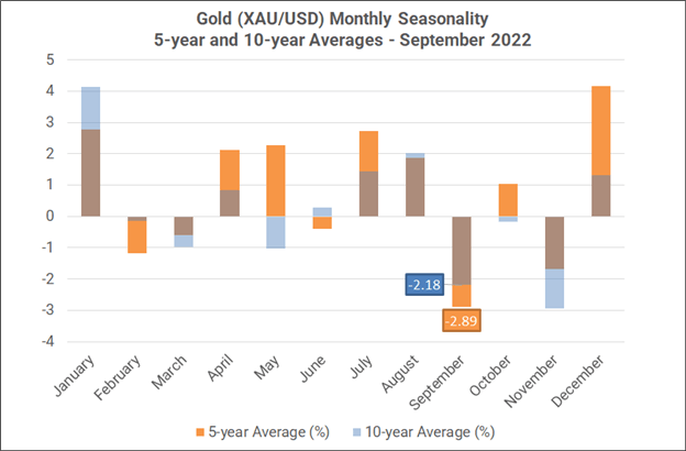 从季节性的角度来看,9月对黄金来说是一个不太友好的月份。以过去的5年数据作为统计,9月份是黄金在一年中表现最糟糕的月份,平均下跌幅度为-2.89%,而在过去的10年中,它是一年中表现第二糟糕的月份,平均跌幅为-2.18%。