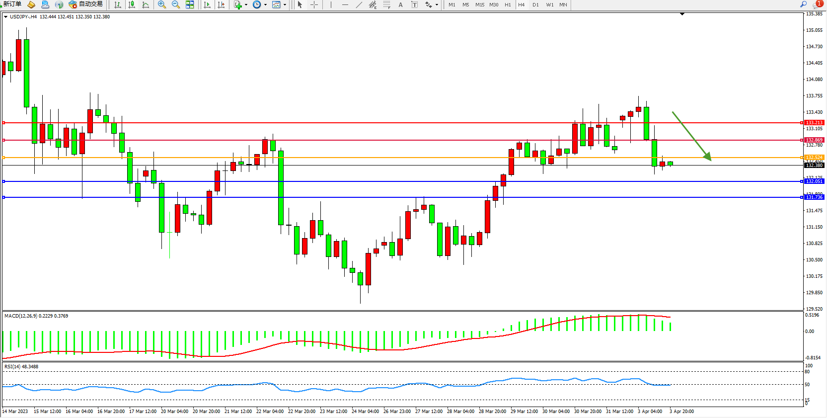 交易策略:132.524下方看跌,目标132.051  131.736
