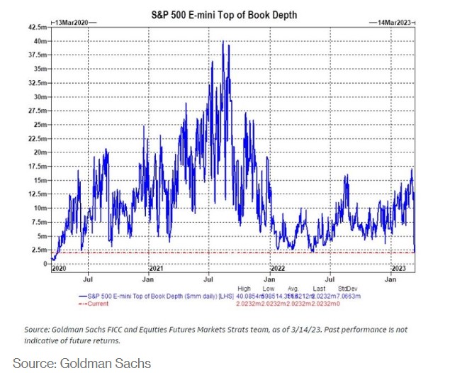 随着上周银行业压力引发美股动荡,人们指责一个熟悉的难题让情况变得更糟:流动性不足。高盛(321.53, -1.12, -0.35%)研究了资金流20年的Scott Rubner计算出,过去两周标普500指数期货的交易便利度已暴跌88%。另外,一个类似的指标显示,美国国债期货的流动性下降了83%。根据Rubner的分析,这两个指标都达到了2020年3月疫情爆发以来的最低水平。